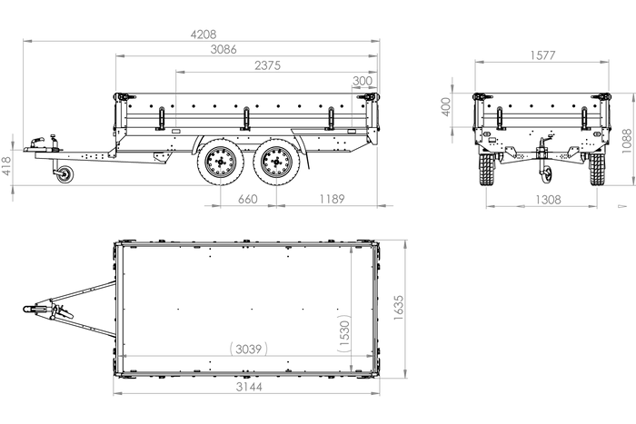Remorque 2 essieux avec une surface de transport de 304×153 cm. PTAC de 400 à 750 kg. Deux essieux non freinés. Entièrement galvanisé.
